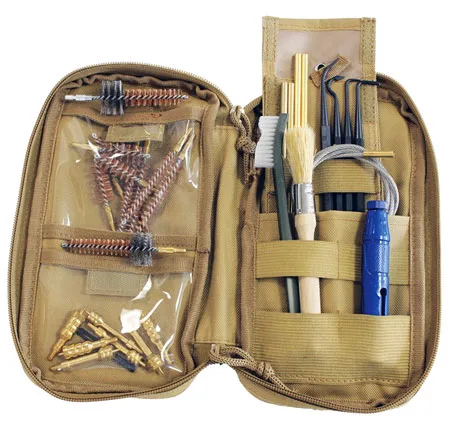 This kit includes: 1 pull through cable, 7 bore brushes, 7 cleaning jags, 1 patch holder, 4 cleaning picks, 4 brass cleaning rod sections, 1 cleaning rod/pull through cable handle, 1 utility brush, 1 cleaning brush, and 2 chamber brushes (.223/5.56 and .308/7.62).