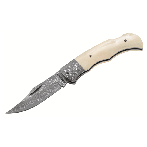 The Magnum Damascus Bone is a magnificent Damascus Pocket Knife featuring a finely drawn Damascus blade and Damascus bolsters. The scales are made of polished bones which results in a beautiful contrast to the darker Damascus steel. The blade is locked by a classic backlock.