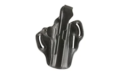 The firearm rides high and is presented at an optimum draw angle. Its thumb break and exact molding, together with a tension device, allows for a secure and highly concealable carry. Belt slots are 1 3/4″ wide. Some models with two belt slots and without tension device.
