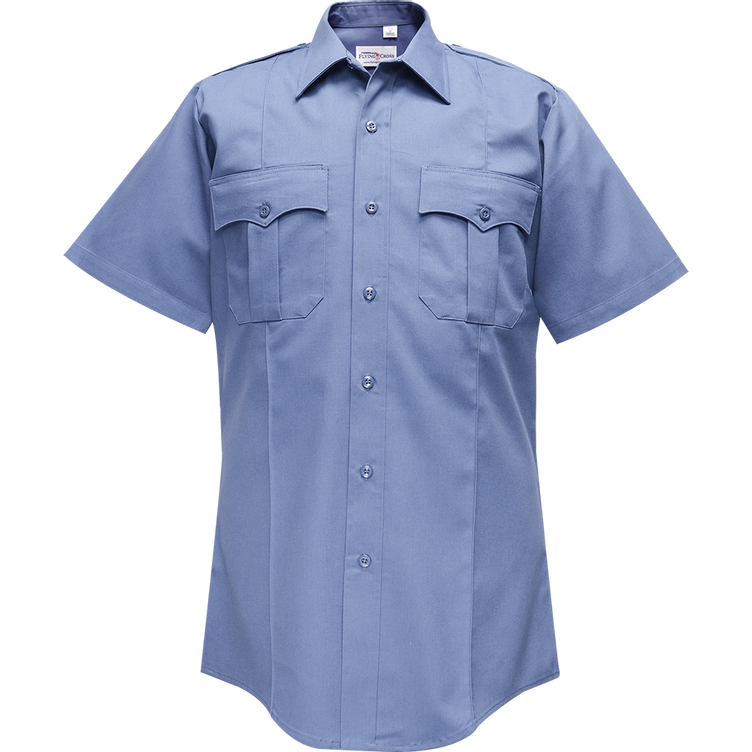 Made in a Duro Poplin style for public safety professionals, this shirt has short sleeves. It is made of 65% polyester and 35% cotton with a seven-button placket front. The shirt has symmetrically cross-stitched shoulder straps for a neat appearance and five sewn-in creases to remove the need for ironing. It offers a full badge sling and comes with a hidden pen compartment in the left breast pocket. The shirt has pleated pockets with scalloped flaps and a Velcro closure. It has a convertible sport collar and comes with a set of permanent collar stays.