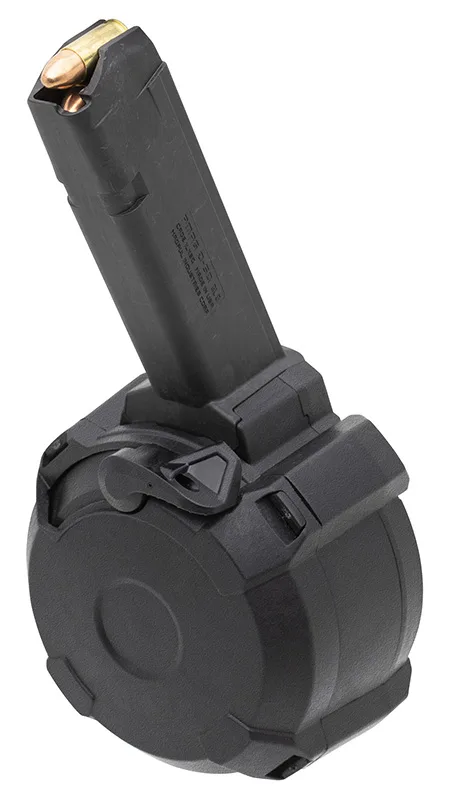 Magpul 9x19mm Parabellum, 50-round drum magazine optimized for double-stack 9mm GLOCK handguns. Providing 50-round capacity, the unique drum configuration keeps the height of the magazine manageable, allowing for easier storage. For easy loading, it includes a ratcheting loading lever that removes tension from the internal spring.