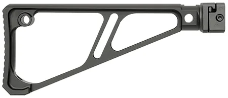 Heavy-duty side-folding mechanism constructed from 4140 heat treated steel, Full-length locking lug for maximum strength, Solid positive lock up in both positions, Steel clamp with large surface engagement, Can be configured to right- or left-folding, Features 5 QD sling attachments, Stock is made from Hard Coat Anodized 6061 Aluminum, Extremely rigid triangular design, Curved top surface for a comfortable cheek weld, Adds 9.0 to overall firearm length, Adds 0.75 to the length of the firearm in the folded position, Complete assembly weight: 15.5 oz., Steel parts are mag phosphate finished