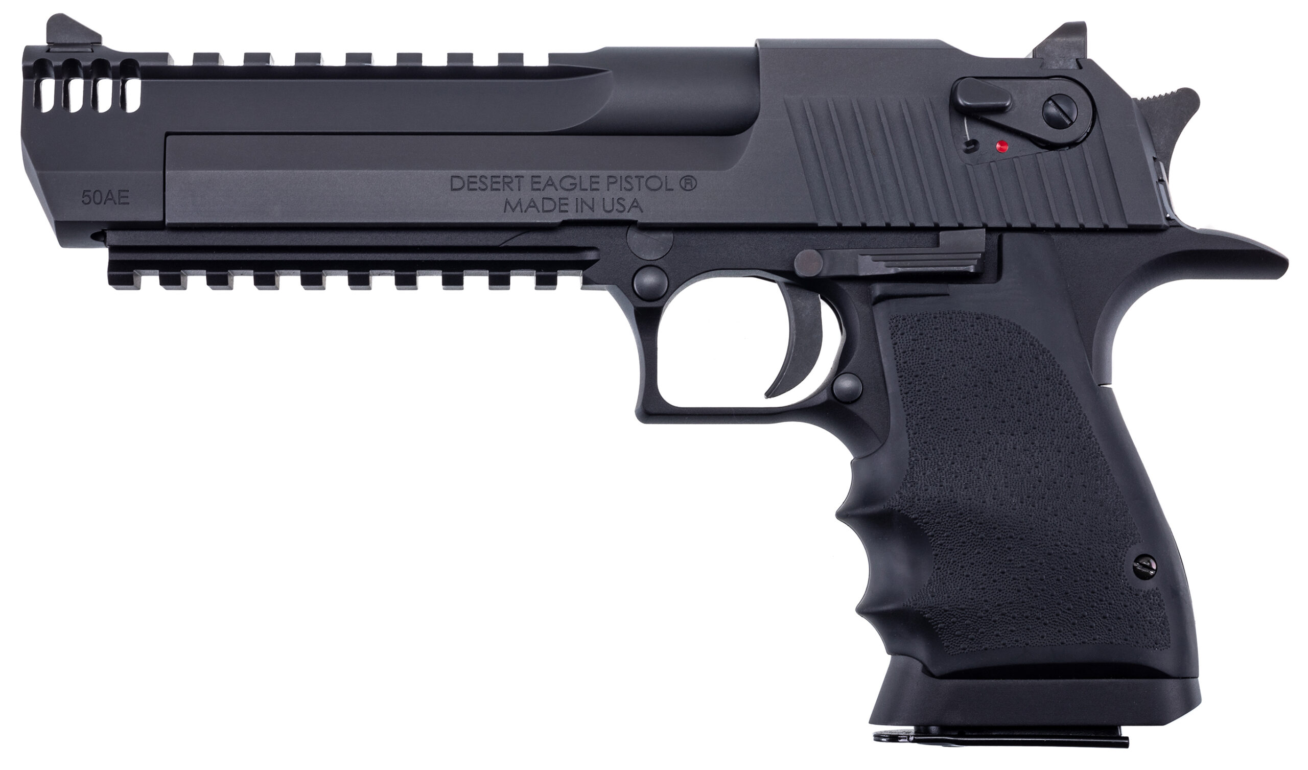 Model: Desert Eagle Mark XIX L6 Series – Caliber: 50AE – Finish: Black Steel Slide And Barrel – Action: Single Action – Frame: Black Hard Coat Alloy Frame – Sight: Fixed – Barrel Length: 6 – Overall Length: 10.75 – Weight: 44 oz – Capacity: 8+1 – # of Mags: 1 – Safety: Ambidextrous Safety – Slide: Aluminum Black Carbon Steel Slide – Muzzle: Integral Muzzle Brake