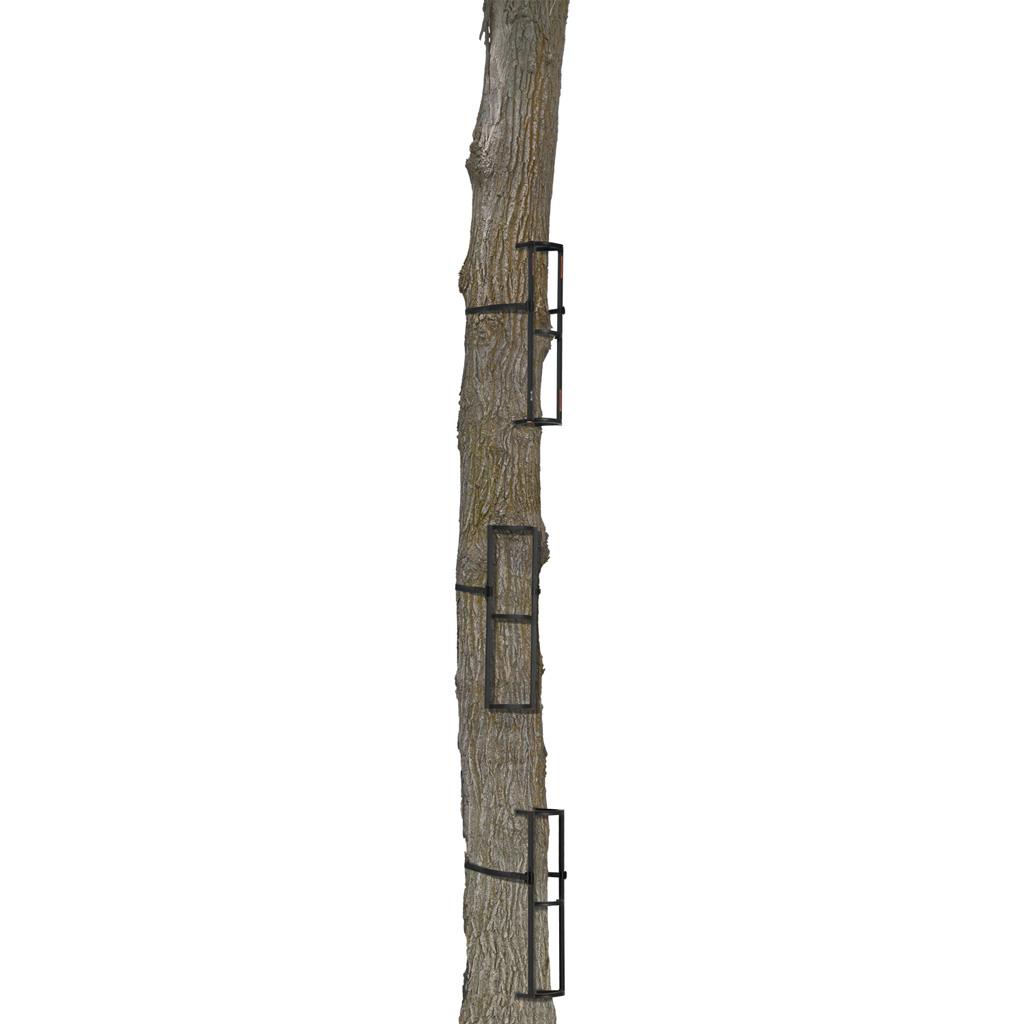Aluminum climbing sticks featuring 9″ wide enclosed steps for added stability. Packable for easy carrying and storage. Works well on both crooked and straight trees. Total height is 12.25’ with 18” between sections. Weighs 12 lbs. Weight rating: 300 lbs.