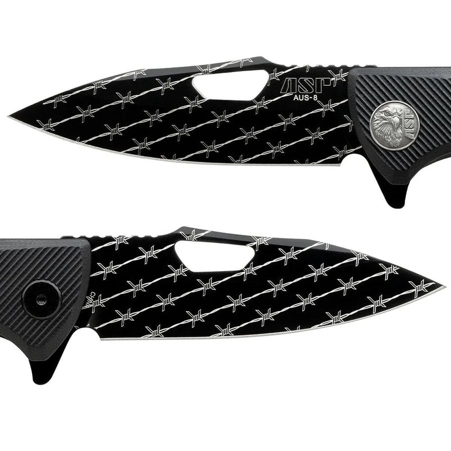 The PDK series of knives is the result of collaboration between law enforcement officers, ASP’s product designers and knife engineering and manufacturing experts. Their goal was to create a practical, tough and dependable knife specifically for day-in, day-out police use. A tool of excellent quality, yet affordable for any officer. The Engraver’s Edition series features five exclusive embellishments, applied to the black blades of our original flat grip, Classic Folder PDK. The designs were created by our master engraver, and meticulously crafted in our state of the art, in-house laser engraving facility. The PDK features a 3.5ââ¬Â drop point ââ¬Åflipperââ¬Â blade design with fast, positive assisted opening. The blade is crafted of highly corrosion-resistant, easy to maintain AUS-8 stainless steel. A liner lock makes it safe and easy to release and close the knife. High-quality, textured G-10 scales (grip panels) provide a sure grip, and our signature Shark Fin jimping adds solid control. PDK knives feature our unique, quick-release pocket clip system. Reversing the clip for right- or left-pocket carry is as fast and simple as using the double lock pin on a handcuff key (not included) to release the clip lock, and snapping it into the slot on the other side. No tiny screws to use (or lose). Finishing touches include a Thin Blue Line tribute spacer in the spine of the knife, and a die struck ASP Eagle medallion mounted in the grip.