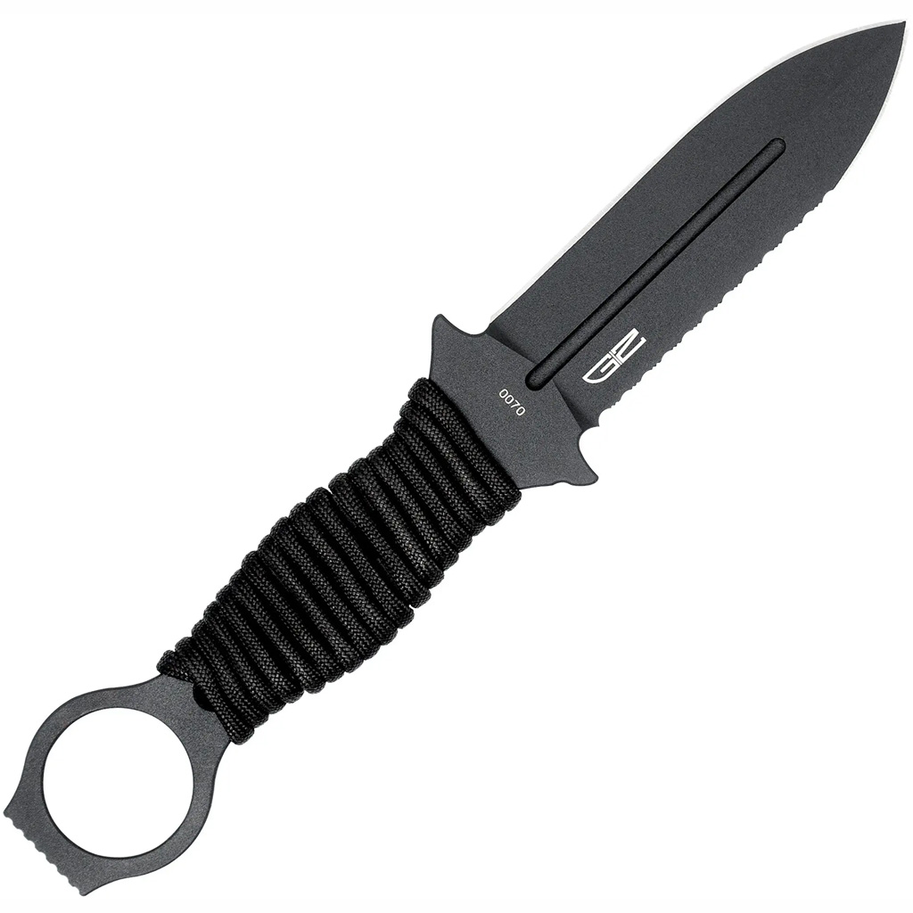 The Ringed Claymore is a compact tactical fixed-blade optimized for close-quarters combat and weapon retention, built for military, law enforcement, and first responders. It features a 4-inch dagger blade with a non-reflective tactical coating and selectable dual plain or plain/serrated edge configurations. The full-tang skeletonized handle reduces weight and includes an oversized retention ring plus 550 paracord for customizable grip. A slotted Kydex sheath with BladeTech MOLLE-Lok compatibility is included for rapid mounting to MOLLE gear.