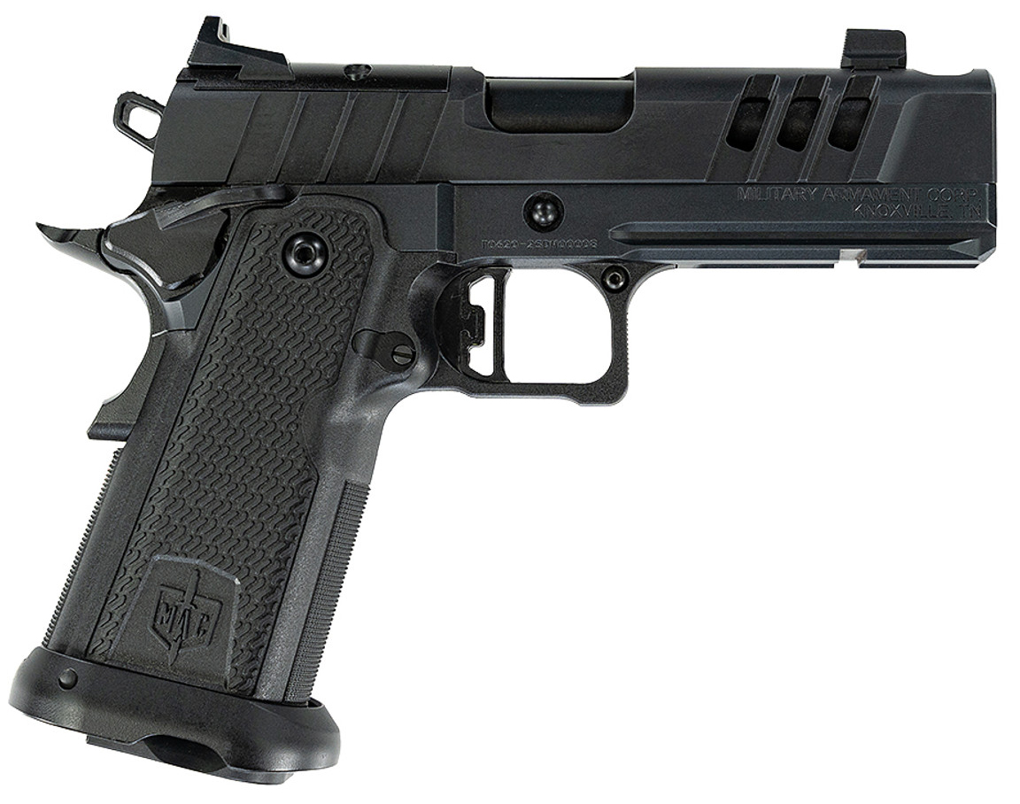 MAC 9 DS COMP 1911 Double Stack – The MAC 9 DS Comp redefines the modern carry pistol with its innovative design and robust features blending cutting-edge engineering with the classic 1911 platform. Crafted for shooters who demand durability precision and tactical versatility this powerhouse is ideal for personal defense professional duty or high-performance range sessions. – Key Features: – Premium Construction: Built with a carbon steel frame and slide featuring a Tenifer QPQ® finish the MAC 9 DS Duty offers exceptional durability and corrosion resistance. Its 4140 hammer-forged steel barrel ensures long-lasting performance and consistent accuracy. – Optics-Ready Design: Equipped with an Agency Optic System footprint the optic plate system allows easy mounting of your preferred red-dot sight for enhanced target acquisition. Includes AOS RMR Plate that will allow most optics to co-witness fiber optic front sight and serrated rear sight providing a reliable backup aiming solution. – Advanced Trigger System: Featuring a newly designed adjustable skeletonized trigger the MAC 9 DS Duty delivers a crisp responsive trigger pull for precise shot control. The skeletonized hammer further enhances performance with faster lock times and a sleek aesthetic. – Ergonomic Polymer Grip: The STI® compatible polymer grip module with a 25 LPI front strap and flat mainspring housing ensures a secure and comfortable hold. Designed for control and comfort during extended shooting sessions this grip enhances overall handling and stability. – Customizable Magazine Release: The new design interchangeable adjustable magazine release allows you to fine-tune your reloads offering tactical efficiency for professional users and competitive shooters alike. – High-Capacity Magazine: Featuring a STI pattern double-stack design the MAC 9 DS Duty comes with two stainless steel 17-round magazines ensuring you have ample firepower for any scenario. – Tactical Forward Serrations: The new forward slide serrations provide an enhanced grip for slide manipulations making press checks and reloads quick and efficient. – Engineered for reliability and crafted with precision the MAC 9 DS Duty Double Stack 1911 delivers unmatched performance and tactical versatility. Whether for duty use competitive shooting or personal defense this pistol brings innovation and classic 1911 craftsmanship together for a modern shooting experience. – Product Family: MDS – Action Type: Semi-Auto – Operation: Single Action – Caliber: 9 MM – Frame/Slide Finish: QPQ Tenifer – Optics Ready/Cut: Agency Optic System RMR Included – Capacity: 17+1 – Sights: Black Serrated Rear Front – Barrel Length: 4.25 Single Port – Threaded: No – Barrel Finish: QPQ Tenifer – Width: 1.5