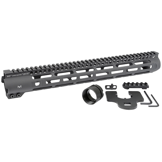4140 Heat Treated Barrel Nut – Barrel Nut and Wrench Included – Features Patented 4140 Heat Treated Torque Plate – 15 overall length – 11.6oz Installed Weight – 6061 Aluminum Type 3 Hard Coat Anodized – MIL-STD 1913 Picatinny Top rail – Two Integral Anti-Rotation QD Sling Sockets – Super Slim 1.5” Outside and 1.3” Inside Diameter – Three Sides of M-Lok – 5-Slot Polymer M-Lok rail included – Fully Dehorned and Deburred – 100% Made in USA- Keeps America Working – MI Lifetime Warranty