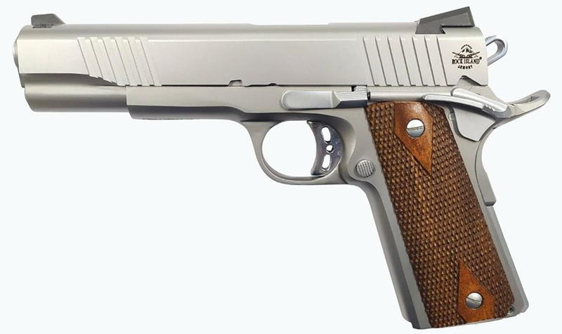Rock Island – Armscor, MFG# 51414, UPC: 4806015514145, UOM: Each, Rock Standard 1911FS, .45 ACP, 5″, Stainless, Wood Grips, 8-rd, CA, MD, Compliant , RIA, RIAHG10, RIAHGALL, HG10, HGALL
