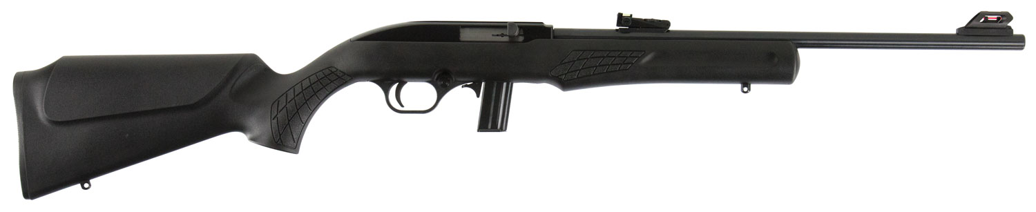 Rossi’s RS22 semi-automatic features an 18″ free-float barrel with adjustable fiber optic sights, synthetic Monte Carlo stock, and a detachable magazine. This model has a black stock.