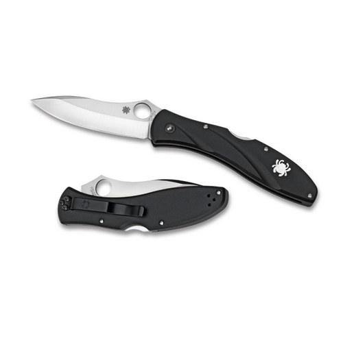The Centofante 3 has a thin-profiled, lightweight FRN handle. Two channels are furrowed out of the handle for better grip and a Palladium silver Spyderco bug is inlayed into its surface. For added security and convenience the back-lock is positioned midway on the spine and David Boye Dent is cut from the locking lever. The VG-10 blade has both a hollow-grind and swedge-grind with non-sharpened spine serrations (jimping) to hold the thumb steady when cutting. A black steel pocket clip positions for tip-up/down, right-hand carry.