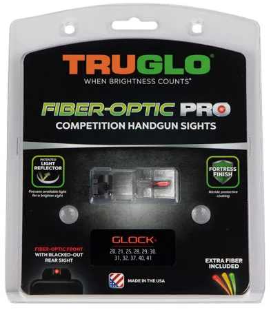 Fiber-Optic Pro delivers a sight picture that is fast and accurate for competitive and recreational shooters. A patented light reflector focuses available light from all angles onto the fiber for a brighter glow, even in low light conditions. Features an Ultra-bright fiber-optic and serrated front sight for fast acquisition, blacked-out and serrated rear sight for increased contrast to reduce glare, fits standard holsters. Fiber diameter: 0.050″. Spare Fiber colors included: Yellow, Ruby Red, Green. Front Sight Length: 1.0″. Front Sight Width: 1.0″. Front Sight Height: 1.0″ Rear Sight Length: 1.0″. Rear Sight Width: 1.0″ Rear Sight Height: 1.0″.