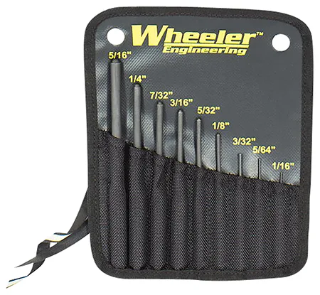 The Wheeler Engineering Roll Pin Punch set is machined from hardened steel to prevent bending or breaking while installing any roll pin. The punches are designed with a hemispherical tip to provide proper alignment of the roll pin to prevent damage to the firearm and the roll pin. The 9 piece set includes: 5/16, 1/4, 7/32, 3/16, 5/32, 1/8, 3/32, 5/64, and 1/16 punches in a durable nylon sheath.